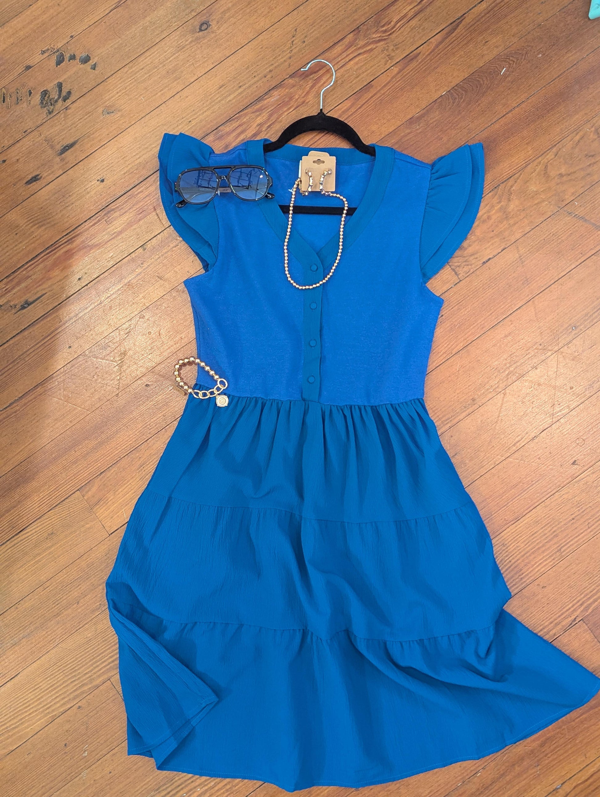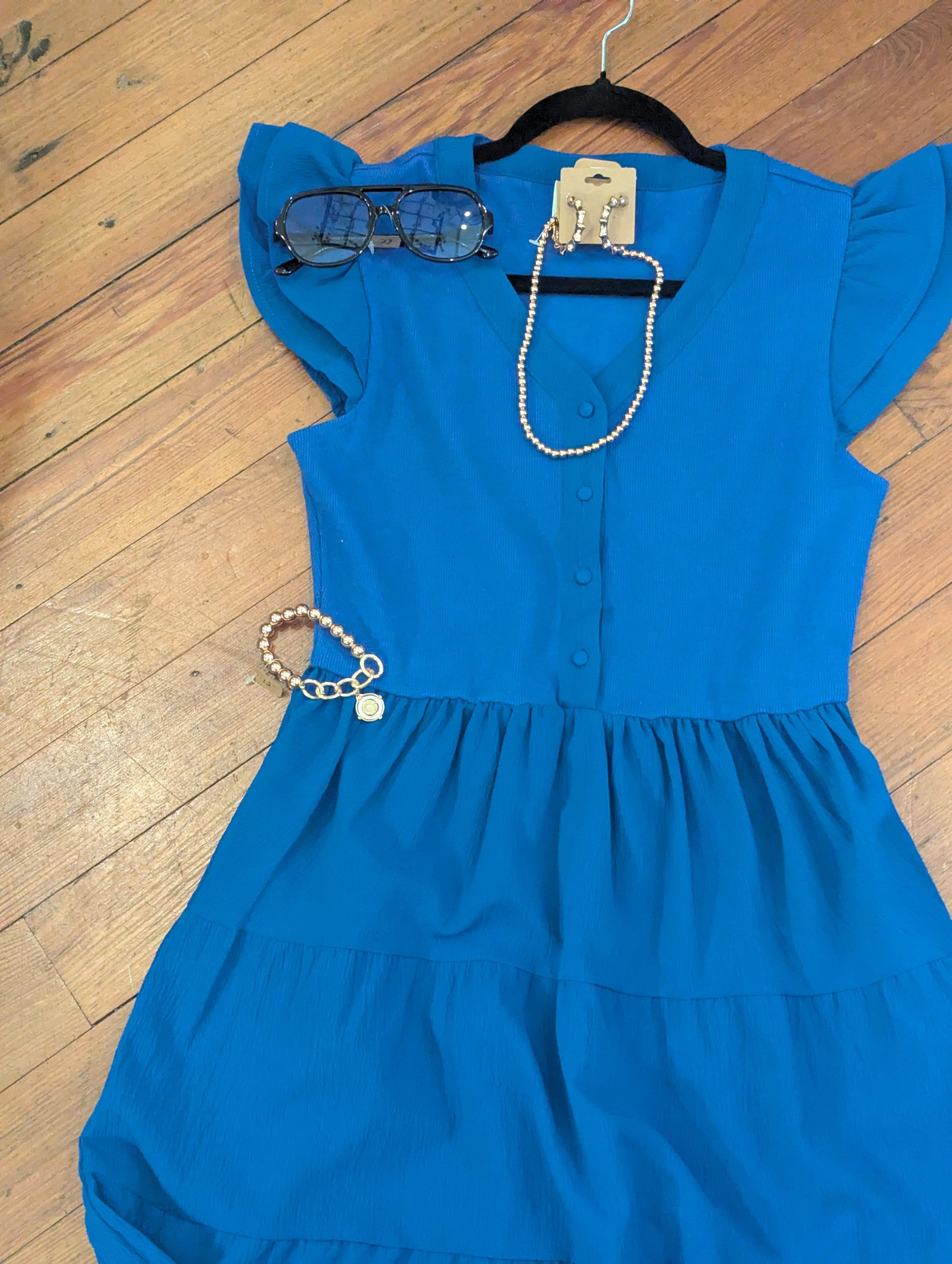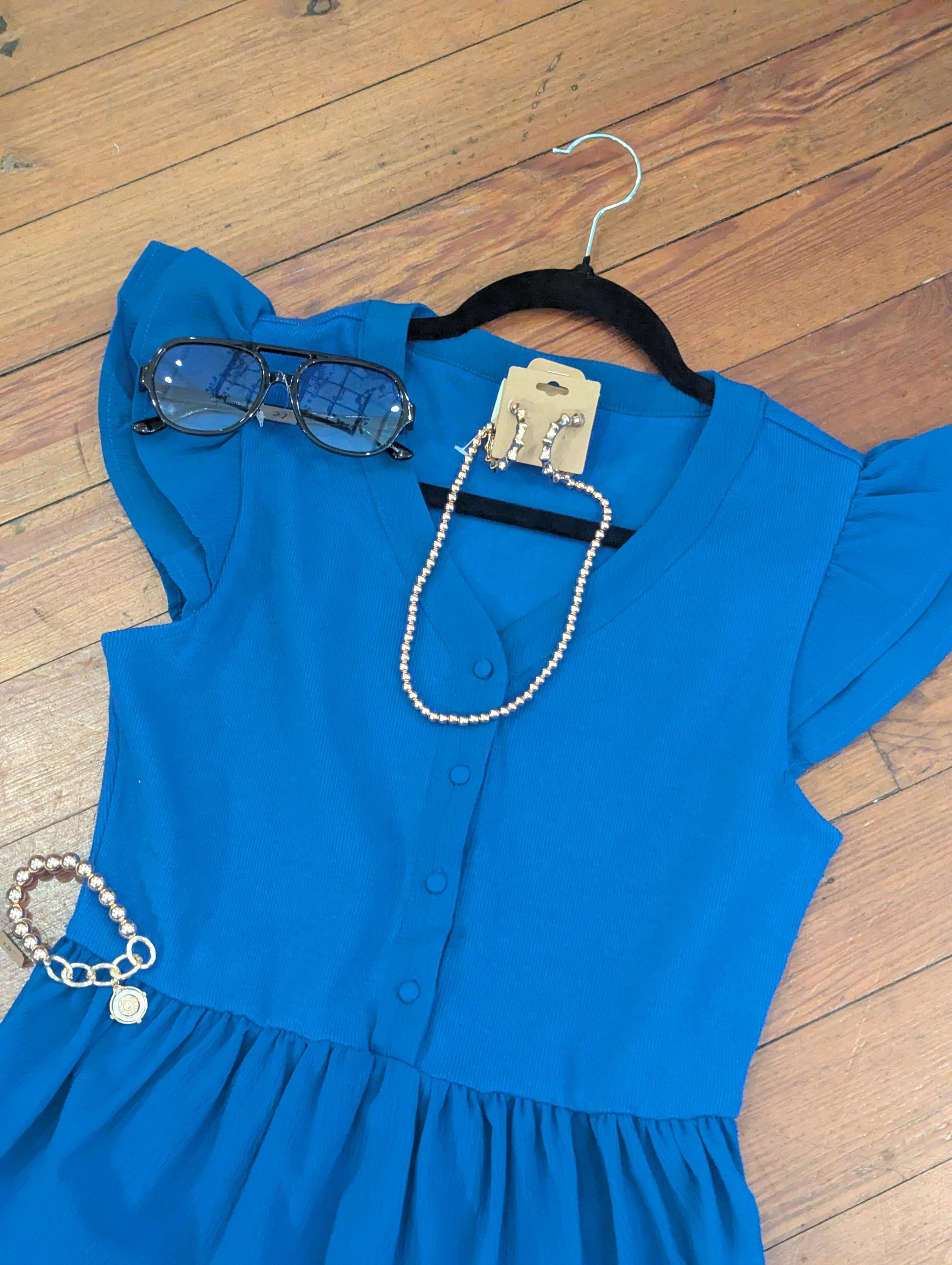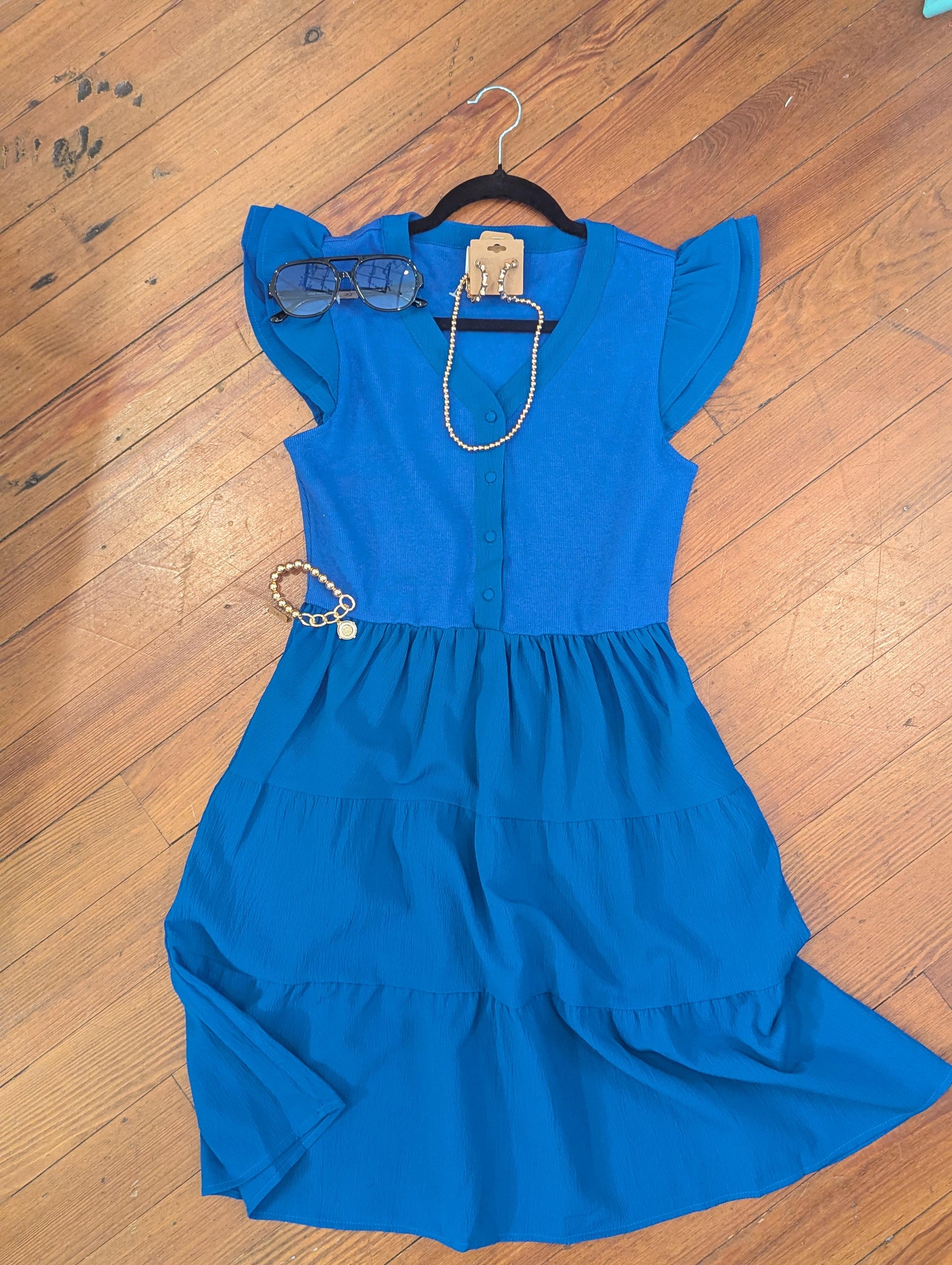Make a bold yet graceful statement in our Bright Blue Flutter Sleeve Dress — a fresh, feminine piece that’s as flattering as it is versatile. The soft flutter sleeves add a touch of whimsy, while the vibrant blue hue brings energy and confidence to any setting.