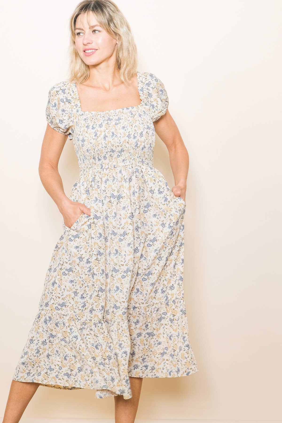 Adorned with enchanting floral prints, this dress features a square neck and elegant cap sleeves. Complete with convenient side pockets and a wide flare skirt, it's the perfect combination of style and functionality for any occasion!