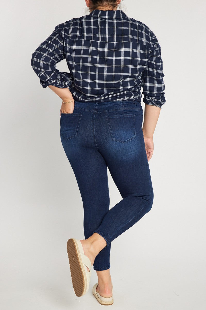 These skinny jeans are so soft and comfortable! Not too dark, but dark enough to look dressy! Blank back pockets. High rise. Cropped.