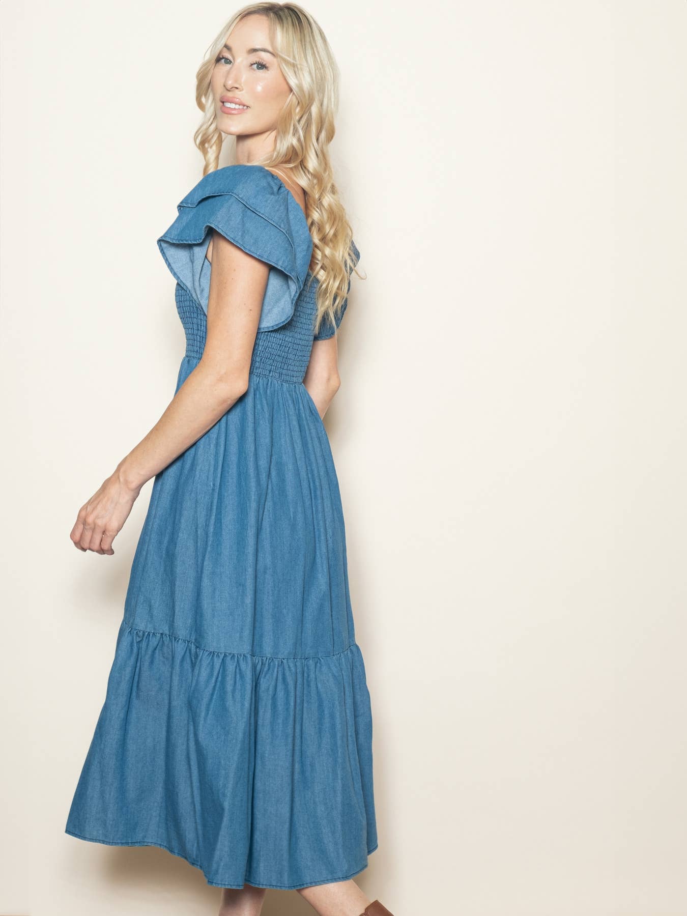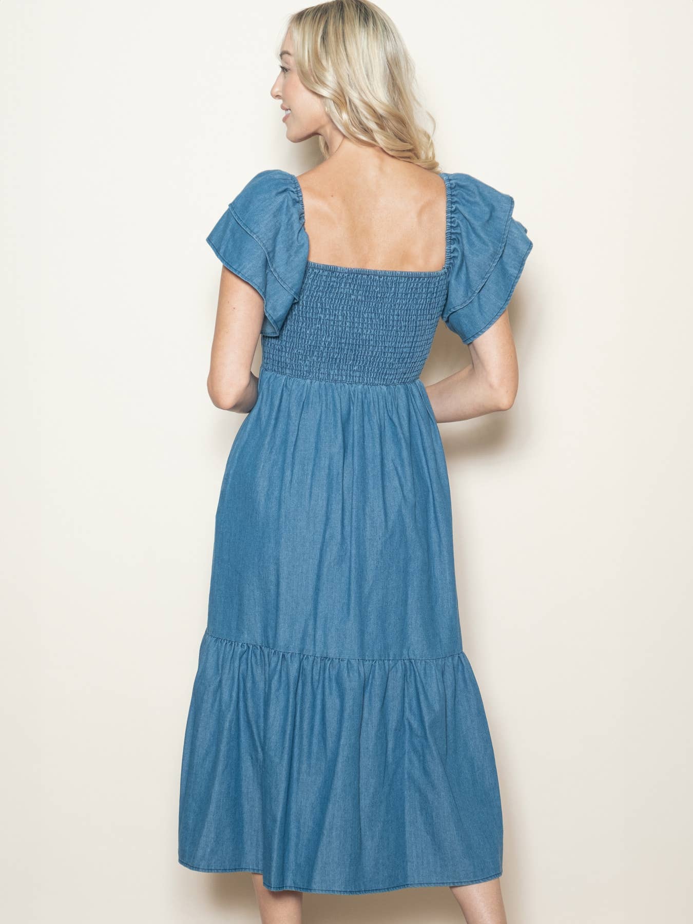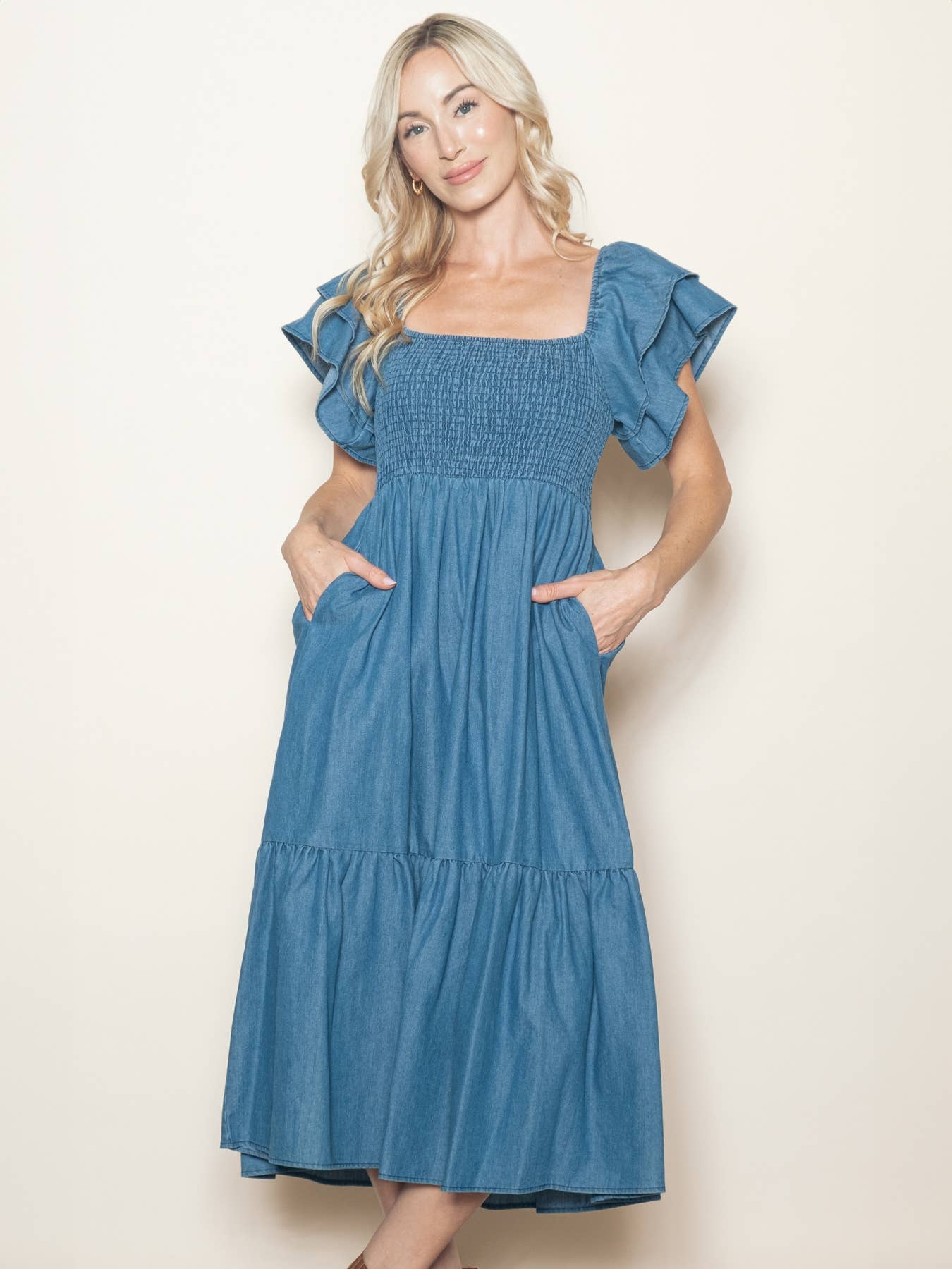 Vintage Wash Chambray Denim Flutter Sleeve Dress w Pockets