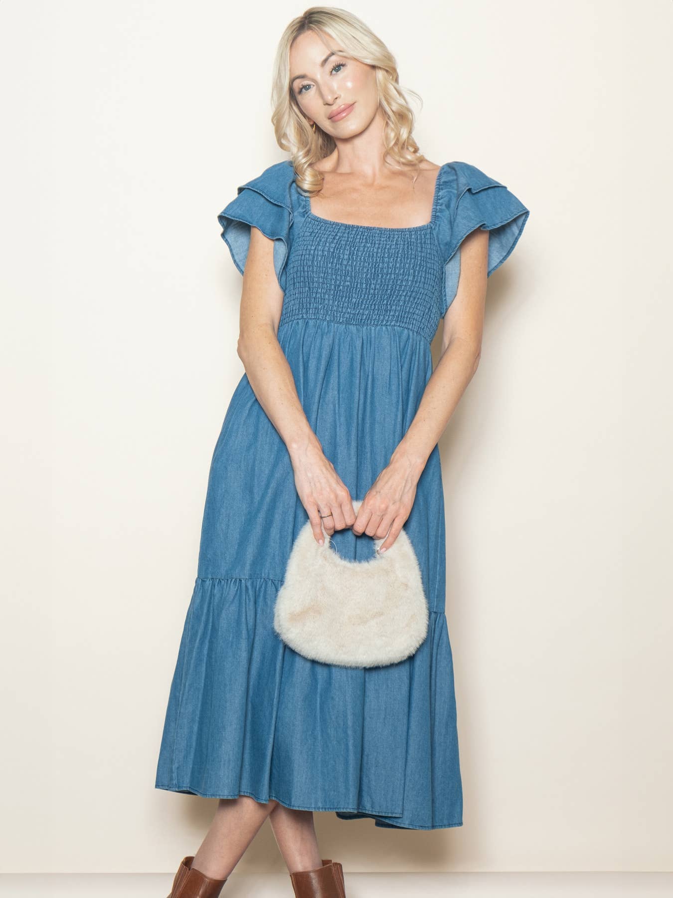 Our Vintage Wash Chambray Denim Flutter Sleeve Dress offers a fresh take on casual chic. Made from soft-touch chambray denim with a vintage-washed finish, this dress features flutter sleeves and a smocked chest for a flattering fit. Complete with side pockets, it’s the perfect blend of relaxed comfort and effortless style.